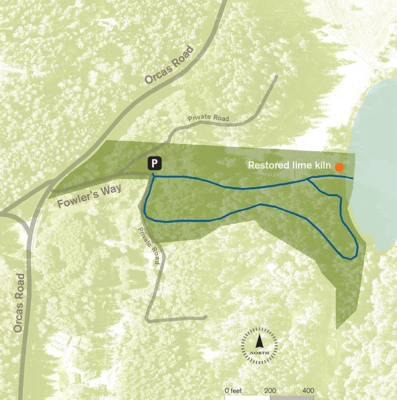 Take Orcas Road for 6.9 miles to Fowler’s Way. Turn right on Fowler’s Way and travel 300 feet to the parking area.