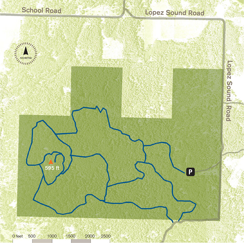 Take Ferry Road heading south. At 2.2 miles, turn left onto Center Road. At 6.45 miles, turn left onto School Road. At 7.55 miles, take a sharp right onto Lopez Sound Road. At 8.8 miles, turn right onto the bumpy gravel entry road., which ends at the parking area, at 9.0 miles from start.